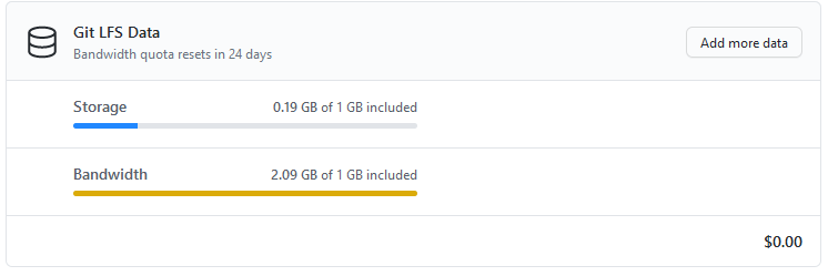 There’s Gitlab, which I don’t believe has bandwidth limits on git LFS pricing but does have a repo size of 10 GB. This limit seems much more tolerable and decent compromise compared to Github. While Gitlab doesn’t have the same developer mindshare as Github, it at least has some (unlike a self hosted Gitea instance that I emigrated).